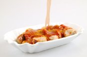 Das ist Kult! Eine Original Currywurst um Mitternacht. Mit heißer Currysoße nach Hausrezept und einem Stück Brot. Stilvoll angereicht in einer Pappe mit Pikser.