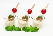 Yakitori Hähnchenspieß, Nürnberger Rostbratwurst auf Kraut, Party-Frikadellen, Spieß von Kirschtomaten & Mozarella, Hamburger Rote Grütze oder Mini-Cakes: Mix, Apfel, Pflaume u. Käse-Rosinen Streusel